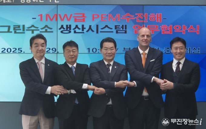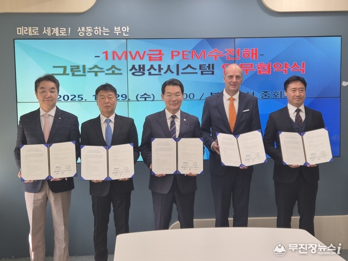 전북도는 10월 29일 부안군청에서 부안군, 현대자동차, 현대건설, 전북테크노파크와 함께 ‘1MW급 PEM 수전해 그린수소 생산시스템 구축 업무협약(MOU)’을 체결했다고 밝혔다. 이번 협약식에는 전북자치도 배주현 청정에너지수소과장, 권익현 부안군수, 팔코 베르그 현대자동차 상무, 서유택 현대건설 상무, 이규택 전북테크노파크 원장 등이 참석해 국내 독자 기술 기반의 그린수소 생산시스템 구축 및 전북 수소산업 생태계 조성을 위해 상호 협력하기로 뜻을 모았다.