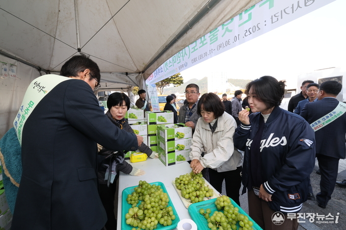 행사 첫날인 30일에는 황인홍 무주군수와 오광석 무주군의회 의장, 곽동열 무주농협장, 양시춘 무주군농협조합공동사업법인 대표, 김범석 농협중앙회 무주군지부장 등 20여 명이 함께 무주 반딧불 샤인머스캣의 우수성을 알리며 소비 촉진에 나서 의미를 더했다.