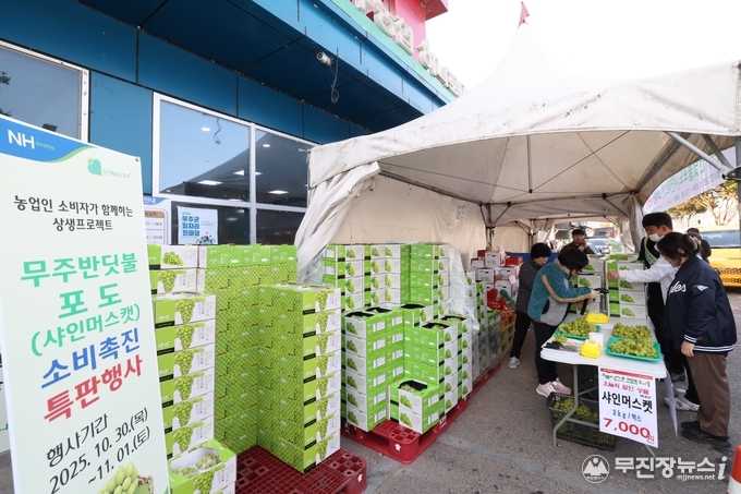 무주군이 10월 30일부터 11월 1일까지 3일간 무주농협 하나로마트 본점에서 ‘무주 반딧불 샤인머스캣’ 판촉 행사를 연다.