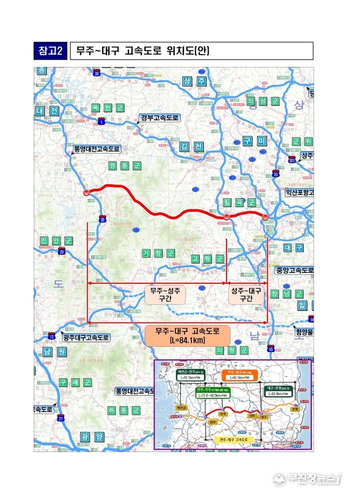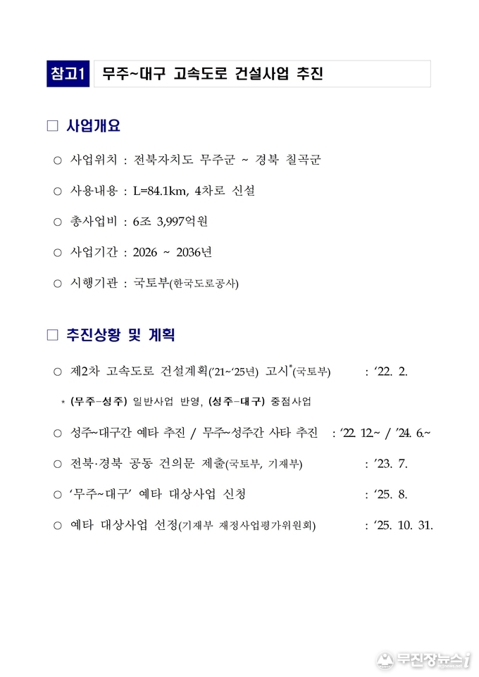 이 사업은 2022년 2월 「제2차 고속도로 건설계획(’21~‘25)」에 무주~성주 구간(일반사업)과 성주~대구 구간(중점사업)으로 각각 반영돼 추진됐으나, 낮은 교통수요 등으로 타당성 확보에 어려움을 겪어왔다. 이에 전북자치도와 경북도, 무주군 등은 예타 통과 가능성을 높이기 위해 두 구간을 하나의 사업으로 통합해 추진하는 방안을 마련하고, 국토교통부와 한국도로공사에 공식 건의했다.
