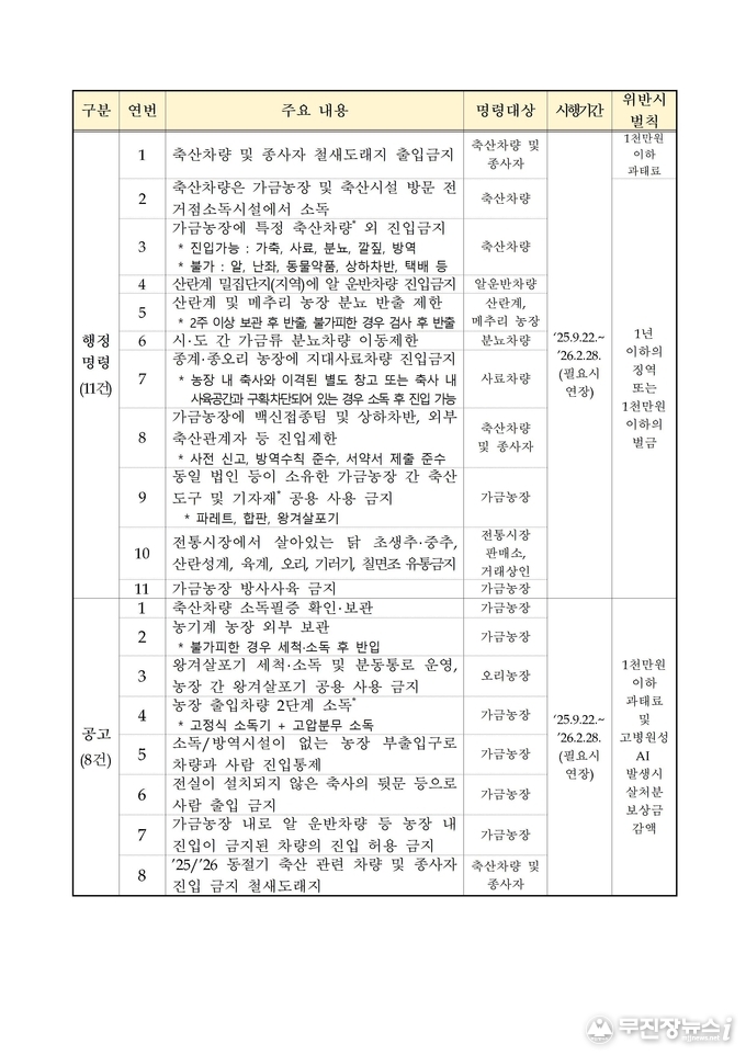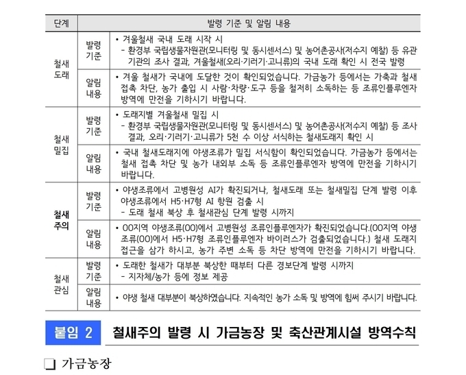 도는 철새 도래지와 수변지역 농가를 중심으로 소독과 예찰을 강화하는 한편, 행정명령 등을 통해 ▲철새도래지 출입금지 ▲농장 진입차량 제한 ▲분뇨 및 가금류 유통 제한 ▲차량 소독필증 보관 ▲출입차량 2단계 소독 의무화 등 선제적 방역 조치를 시행 중이다.