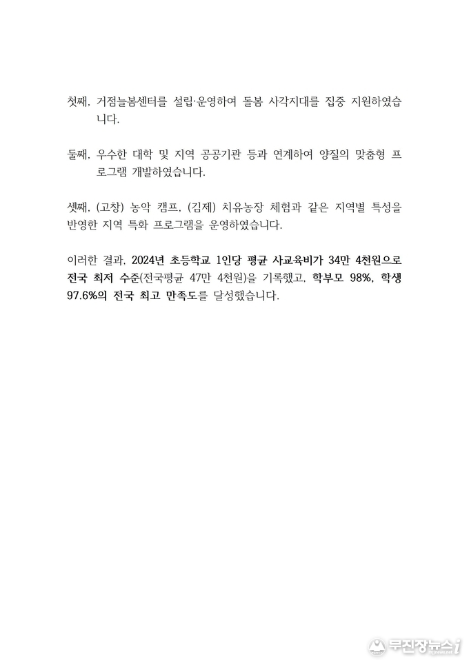 전북교육청은 모든 지표에서 합격점을 받은 가운데 사교육비 경감, 학력향상 지원, 안전한 학교 환경 조성 등의 지표에서 특히 뛰어난 성과를 거두며 국가교육·돌봄 책임을 선도했다는 평가를 받았다.