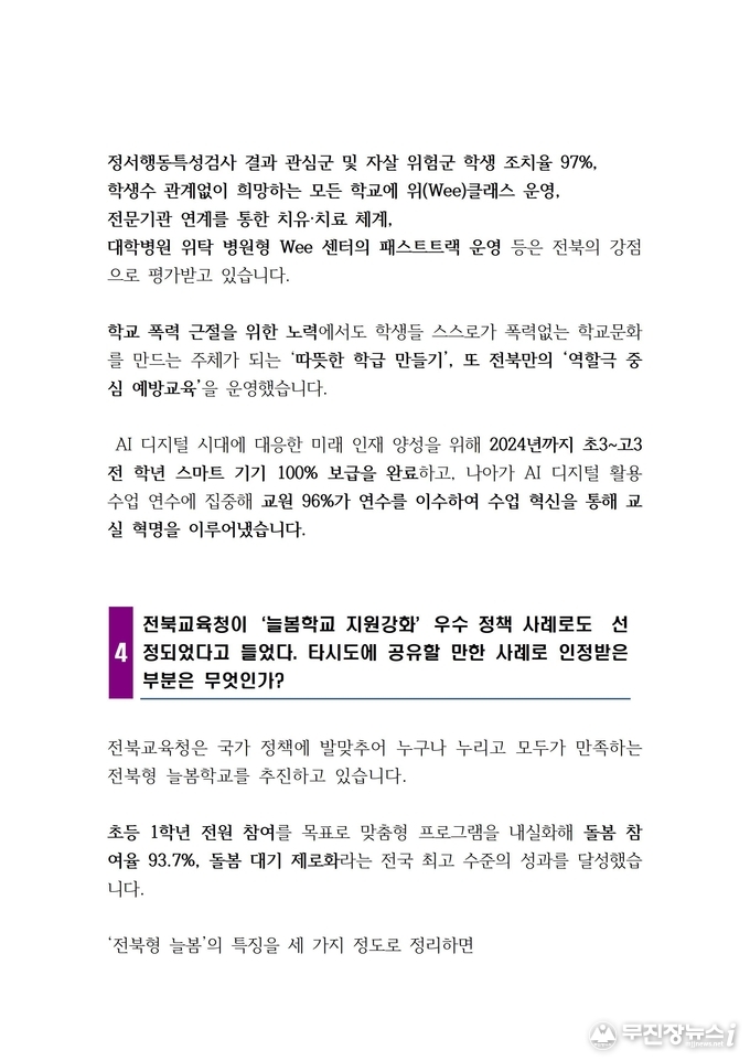 이번 평가에서는 특히 전국적 주목을 받은‘전북형 늘봄’이 전북 실정에 맞게 늘봄 프로그램을 운영한 모범 사례로 꼽혔다.