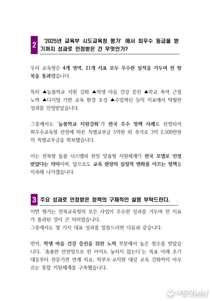 전북특별자치도교육청은 교육부 주관 2025년 시·도교육청 평가에서 4개 영역, 21개 전 지표를 모두 통과하며 ‘최우수 교육청’에 선정됐다고 4일 밝혔다.