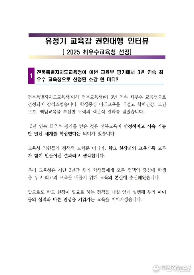 유정기 교육감 권한대행은 “이번 성과는 전북교육이 학생 중심, 정책 책임성, 현장 연계의 가치를 꾸준히 실천한 결과”라며 “대한민국 교육의 중심에 선다는 사명감으로, 교육 본질에 충실한 정책을 흔들림 없이 이어가겠다”고 밝혔다.