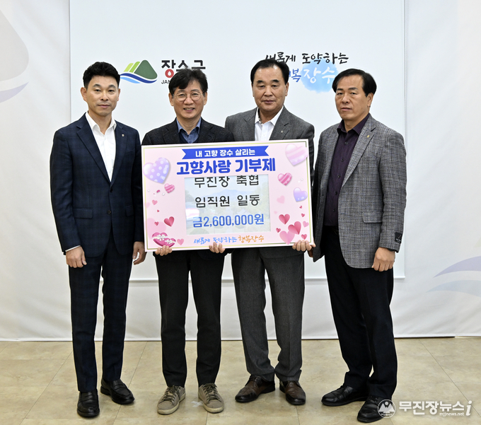 최훈식 장수군수는 “매년 잊지 않고 고향사랑기부제에 함께해주신 무진장축협 임직원 여러분께 깊이 감사드린다”며 “보내주신 소중한 기부금은 장수군의 더 나은 미래를 위해 군민 복지와 지역 발전에 의미 있게 사용하겠다”고 밝혔다.