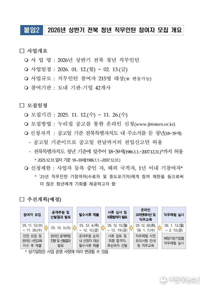 참여 신청은 전북 청년 직무인턴 공식 누리집(www.jbintern.or.kr)을 통해 온라인으로만 가능하다.