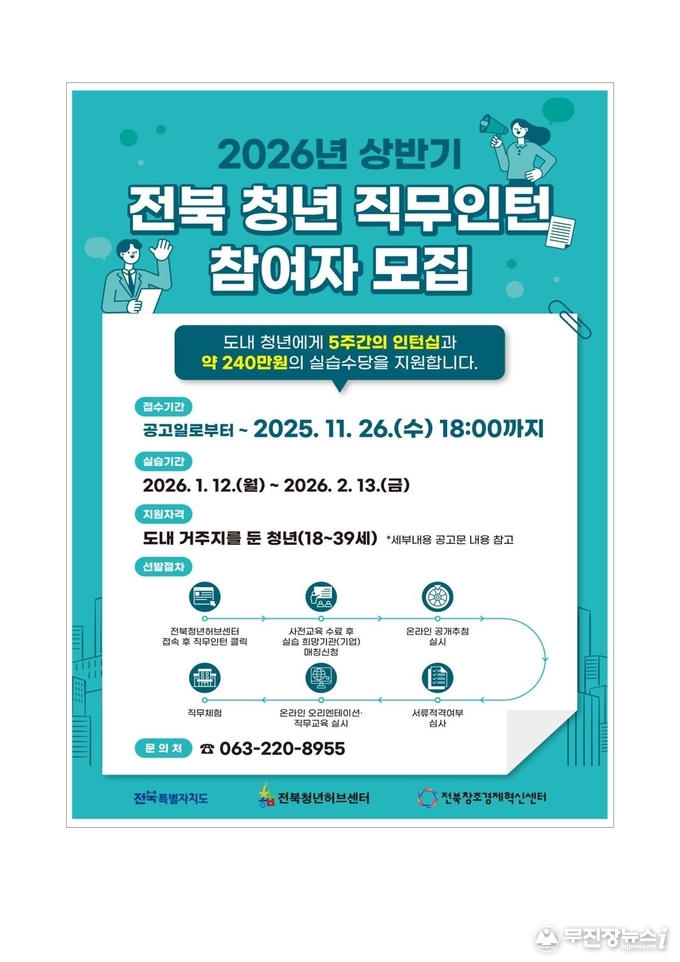 전북특별자치도와 전북창조경제혁신센터가 ‘2026년 상반기 전북 청년 직무인턴’ 참여자를 11월 26일까지 모집한다.