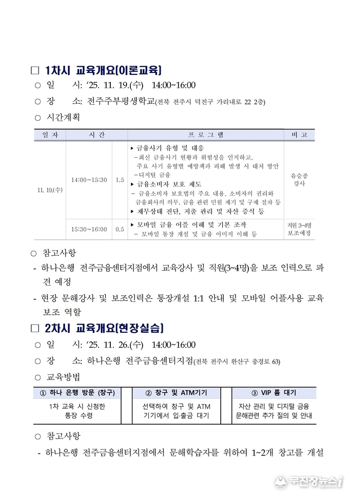 금융디딤돌 교육은 19일 1차 교육에서 디지털 금융의 기초 이해와 금융사기 예방을 위한 이론 교육을 실시한 뒤, 26일 2차 교육에서는 학습자들이 하나은행 전주금융센터지점을 직접 방문해 은행창구 및 ATM 기기를 활용한 실습을 진행하는 총 2회 과정으로 운영된다.