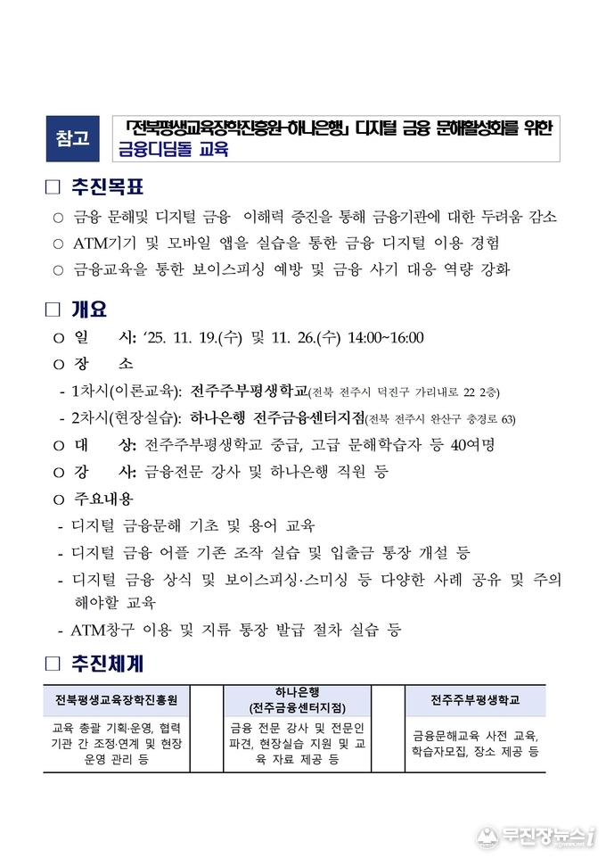 전북특별자치도평생교육장학진흥원(이하 ‘진흥원’)과 하나은행 전주금융센터지점은 고령층 문해학습자의 금융 접근성을 높이고 금융사기 예방 역량을 강화하기 위해 19일 전주주부평생학교에서 「금융디딤돌」 교육을 추진한다.