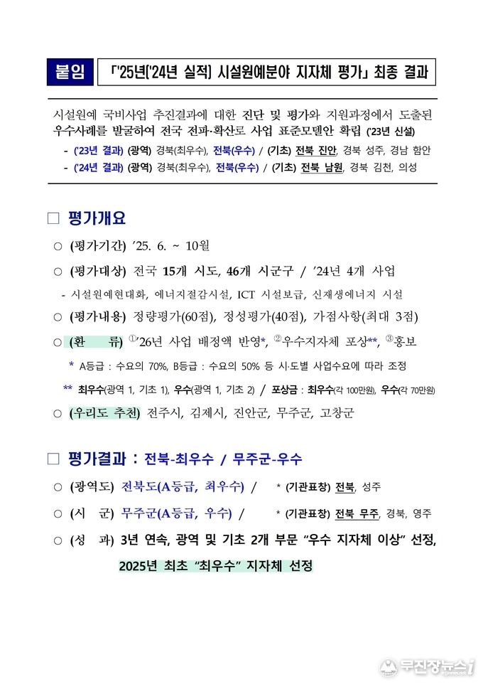 이번 평가는 전국 15개 광역시도와 46개 시·군을 대상으로 진행했으며, 예산 집행율과 사업 추진 실적을 반영한 정량평가와 지원체계 구축 및 사업 확산 노력을 평가한 정성평가 결과, 전북자치도는 최우수 지자체로 무주군은 우수지자체로 각각 선정됐다.
