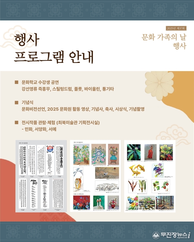 29일에는 ‘제37회 문화가족의 날’ 행사가 전통생활문화체험관과 최북미술관 등지에서 개최된다. ‘문화학교’의 1년 활동을 결산하는 자리로, 지역 내 문화예술인들의 소통과 화합의 장이 될 것으로 보인다.