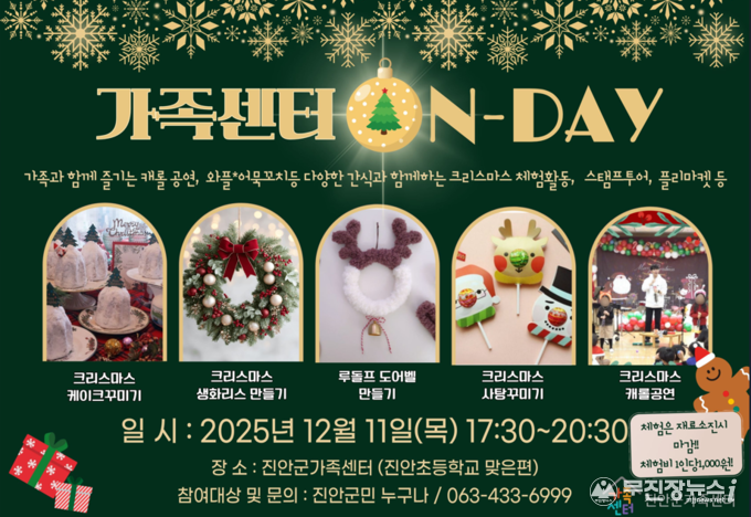 진안군은 가족 소통 공간으로 자리매김하고 있는 진안군가족센터에서 오는 12월 11일(목) 17시 30분 부터‘온데이(ON-DAY) 크리스마스 행사’를 개최한다고 밝혔다.