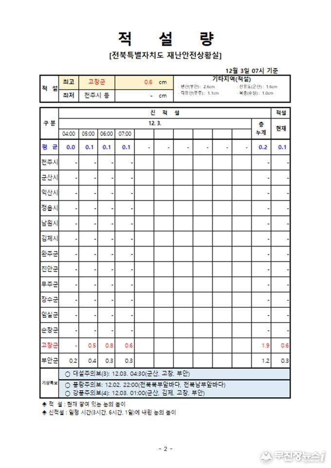 전북특별자치도가 3일 4시 30분 고창, 부안, 군산 3개 시‧군에 대설주의보가 발표(4시 30분 발효)됨에 따라 재난안전대책본부 1단계 비상근무를 가동했다.