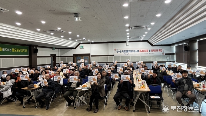 진안군 성수면 기초생활거점조성사업 주민위원회(공동위원장 임기성, 정순석)는 지난 2일 성수면 행정복지센터에서 지역리더 및 주민위원 100여 명이 참석한 가운데 “2025년 성과공유회 및 지역리더 특강”을 성황리에 개최했다.