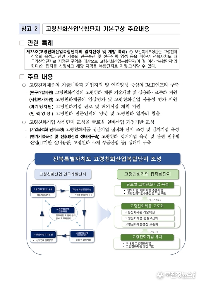 5개년 진흥계획은 전북특별법 제34조에 근거해 국내외 고령친화산업 현황 분석, 복합단지 조성 방안, 운영계획, 재원조달 및 연도별 사업계획이 포함됐다. 새만금 국가산업단지 약 40만 평 중 산업용지 20만 평에 고령친화기업을 집적화하고, 복합용지 4만 평에는 고령친화산업기술원 등 5개 기술지원 및 인증지원시설을 구축할 예정이다.