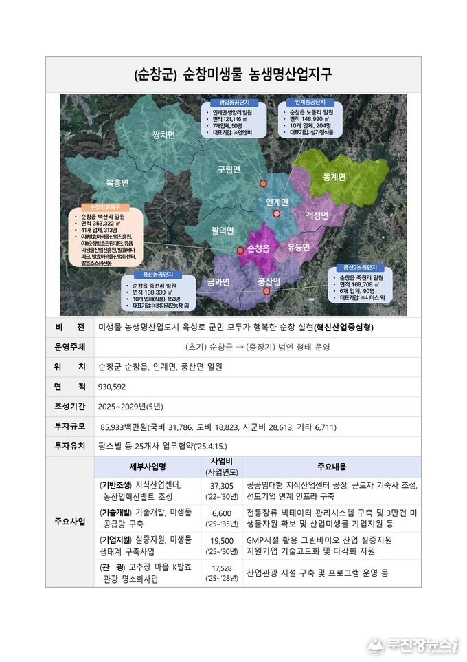 순창 미생물 농생명산업지구(93㏊)는 지역 특화 미생물 자원과 발효 기술을 활용한 글로벌 미생물 융복합 산업지구로 조성된다. 공공임대형 지식산업센터, 농산업혁신벨트, 산업용 미생물 공급망, 그린바이오 실증지원시설 등 핵심 기반을 구축하고, 고추장 마을 중심의 ‘K-발효 관광 명소화’도 추진한다. 이를 통해 산업과 관광을 접목한 융합모델로 지역경제 다변화를 유도한다.