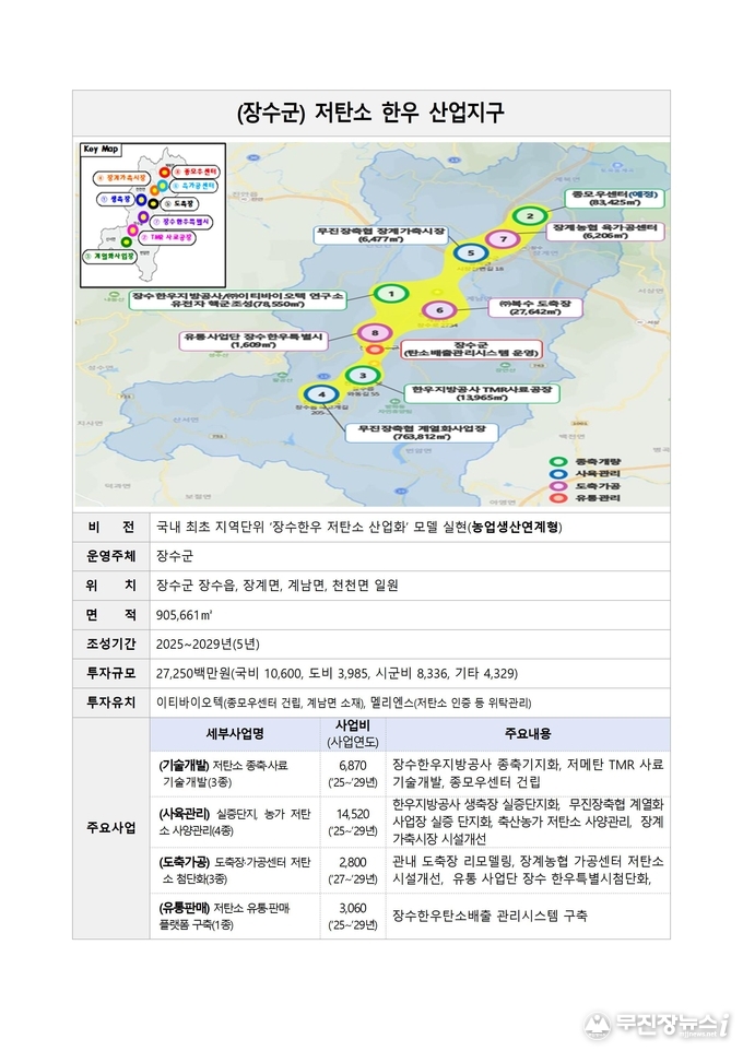 장수 저탄소한우 산업지구(90.6㏊)는 장수 한우 자원을 기반으로 저탄소 종축·사료 기술개발, 농가 사양관리, 도축·가공시설 첨단화 등을 연계한 저탄소 공급사슬을 구축한다. 축산분야 탄소 감축 실천모델로서 전국 최초의 지역 단위 저탄소 축산 산업화를 실현한다는 데 의미가 있다. 여기에 이티바이오텍, 멜리엔스 등 기업도 참여해 종모우센터 설립과 인증관리 위탁 등 기술기반 확보에도 기대가 모인다.