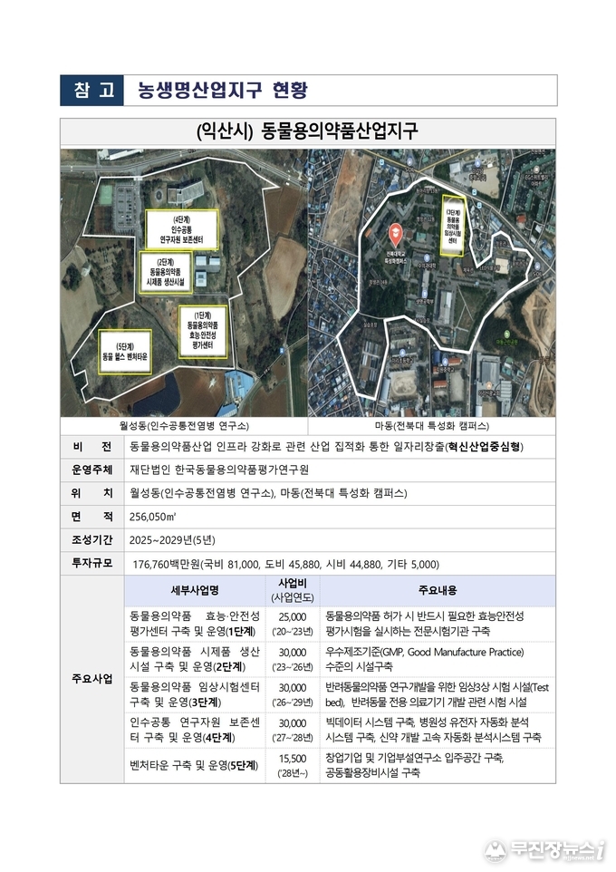익산 동물의약품 산업지구(25.6㏊)는 동물용의약품의 연구개발부터 임상시험, 시제품 생산, 효능 및 안전성 평가, 자원 보존에 이르는 전 주기를 포괄하는 클러스터로 조성된다. 인수공통전염병연구소 등 지역 연구기관과 연계한 연구기반도 확충해 산업 집적화를 추진하고, 향후 벤처 벤처타운 구축을 통해 창업기업 유치와 기업부설연구소 입주도 병행해 산업 생태계 확장을 도모한다.