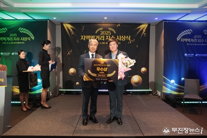 지난 9일 대전 인터시티호텔에서 열린 ‘2025년 지역먹거리 지수 결과발표 및 시상식’에 참석한 김남수 진안군 농축산유통과장은 “이번 2년 연속 수상은 진안군민과 지역 농업인이 함께 노력하여 이룬 소중한 결실”이라며, “앞으로도 지역 농산물 소비 확대와 군민의 안전한 먹거리 보장을 위한 지속 가능한 먹거리 정책을 더욱 강화해 나가겠다”라고 소감을 밝혔다.