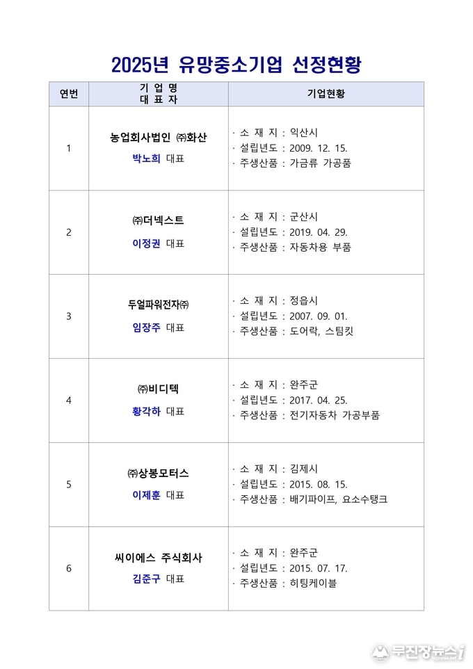 한편, ‘전북특별자치도 유망중소기업’은 도내에서 3년 이상, 상시근로자 5인 이상, 매출액 3억 원 이상의 제조업 또는 지식기반산업을 영위하는 중소기업을 대상으로 1999년부터 매년 12개 내외 기업을 선정하고 있으며, 올해까지 총 534개 기업이 지정됐다.