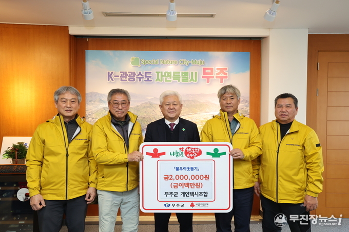 무주군 개인택시조합 회원들은 지난 11일 무주군에 이웃돕기 성금 2백만 원을 기탁했다.