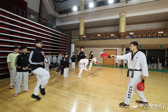 학생들은 ‘2004년 아테네 하계올림픽 태권도 금메달리스트’이자 ‘IOC 선수 위원(2008~2016)’, 2017 무주태권도선수권대회 조직위원회 집행위원을 지낸 문대성 광주대학교 스포츠과학부 석좌교수로부터 태권도 기본자세와 발차기 등을 배우는 시간을 가졌다.