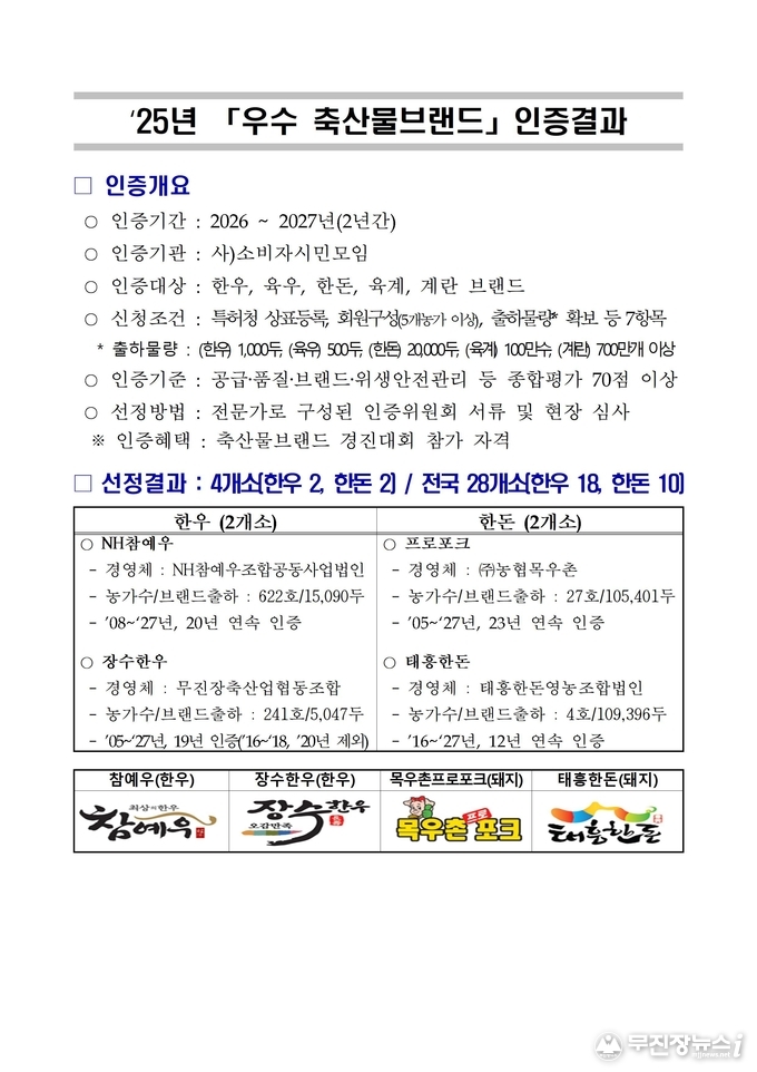 전북특별자치도는 (사)소비자시민모임이 주관한 ‘2025년 우수축산물 브랜드 인증’ 심사에서 도내 4개 축산물 브랜드가 품질·위생·안전성 등 전반에서 우수한 평가를 받아 인증을 획득했다고 16일 밝혔다.