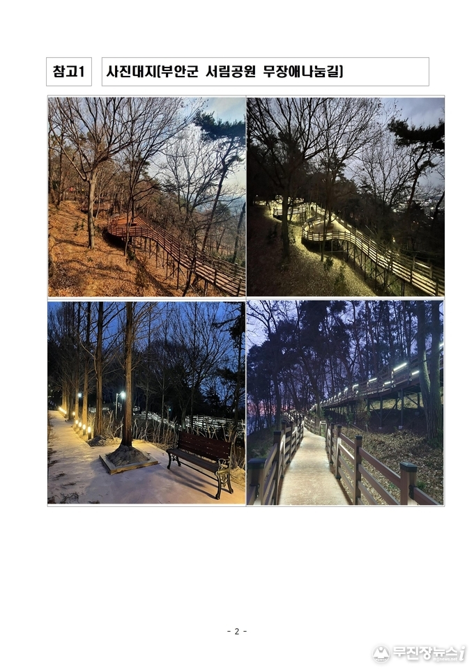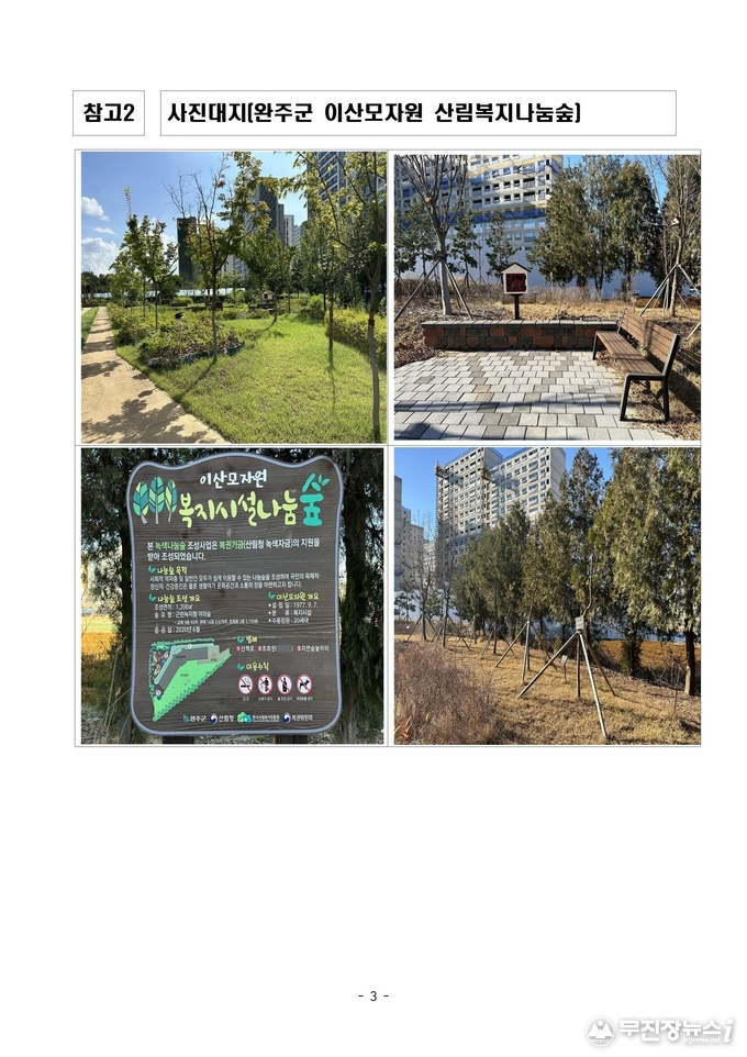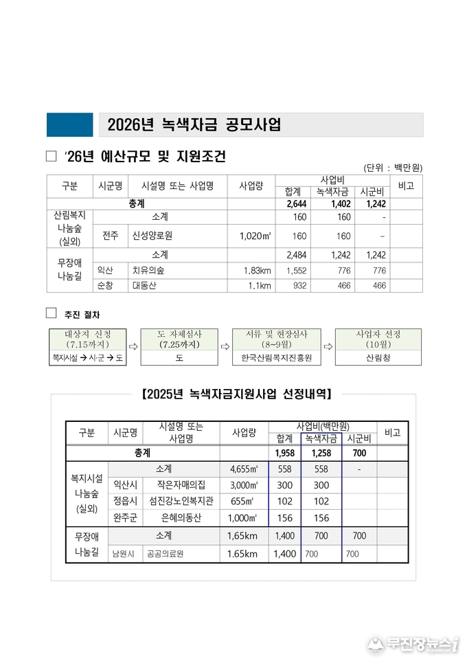 한편 전북도는 2026년 녹색자금 공모사업에서 26억 4,400만 원을 확보해 전주 ‘신성양로원 나눔숲’, 익산 ‘치유의숲 무장애나눔길’, 순창 ‘대동산 무장애나눔길’ 등 3개 지구 신규 조성사업을 추진한다. 이를 통해 취약계층 생활환경 개선과 보행약자 접근성 향상에 기여하는 녹색복지 기반이 더욱 확대될 전망이다.