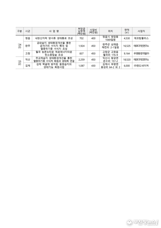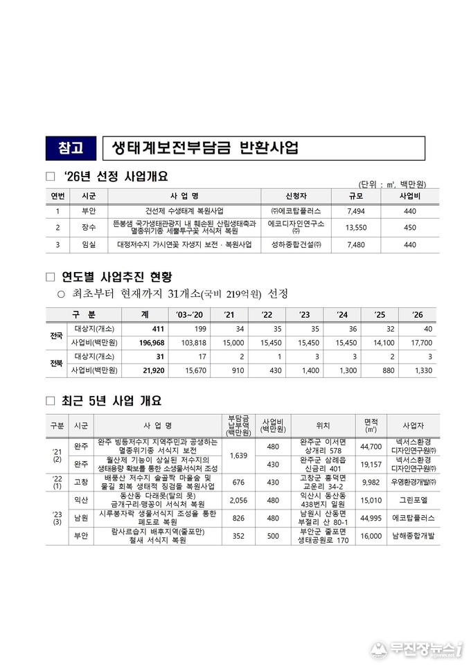 전북특별자치도는 기후에너지환경부가 주관한 ‘2026년도 생태계보전부담금 반환사업’ 공모에서 장수·임실·부안 등 도내 3개 지역이 최종 선정됐다고 19일 밝혔다. 이번 선정으로 확보한 사업비는 총 13억 3,000만 원(국비)으로, 훼손된 생태계 복원과 생물다양성 보전을 위한 사업이 추진된다.