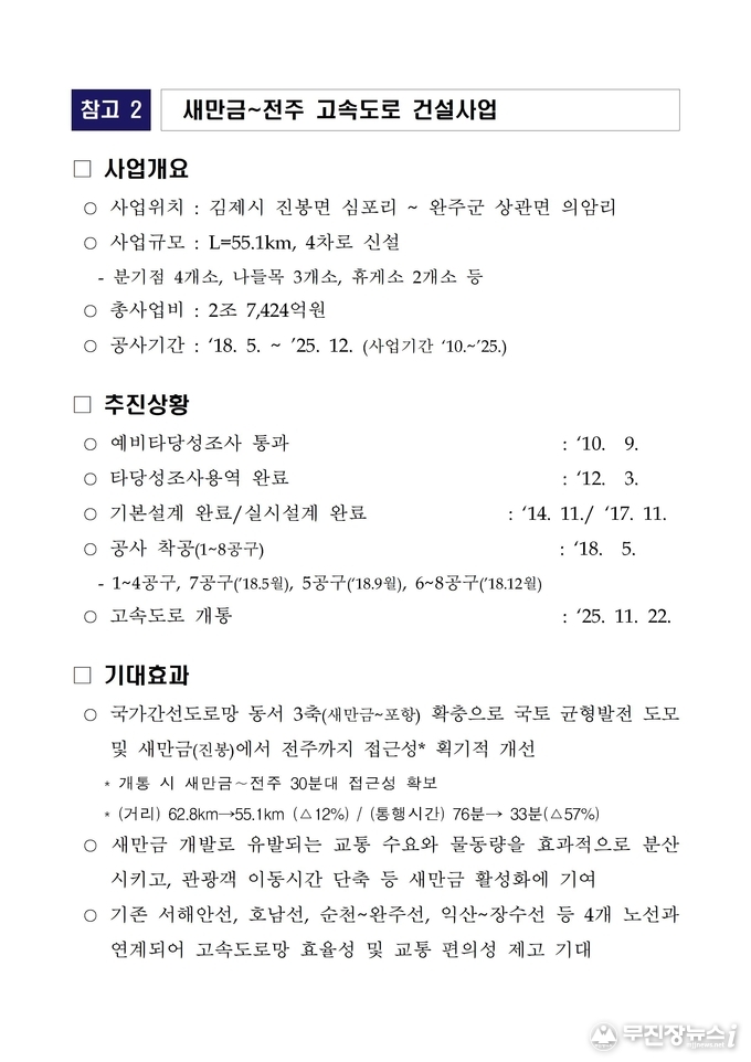 이와 함께 11월 22일 새만금~전주 고속도로(55km)가 개통되며 새만금에서 전주까지의 통행 시간이 기존 76분에서 33분으로 43분, 약 57% 단축됐다. 이는 국가 간선도로망 동서 3축(새만금~포항)의 서측 관문을 여는 핵심 성과로, 전북의 광역 접근성을 크게 개선했다. 또한 무주~대구 고속도로(84km)가 예비타당성조사 대상사업으로 선정되면서 동서 3축 완성을 위한 토대를 닦았다.