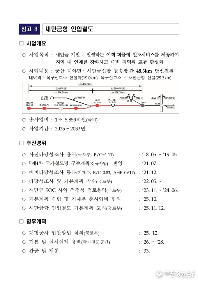 새만금 트라이포트 구축을 위한 기반도 병행됐다. 새만금항 인입철도 기본계획이 확정·고시돼 군산 대야면에서 새만금신항까지 48km 단선전철 건설이 본격화됐고, 새만금 지역 간 연결도로 예산도 전년 대비 1,228억 원 증액된 1,630억 원을 확보하며 사업 추진에 속도가 붙었다.