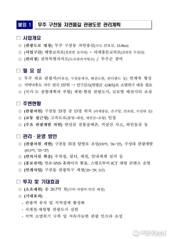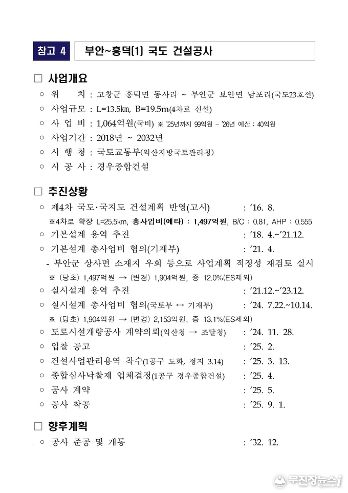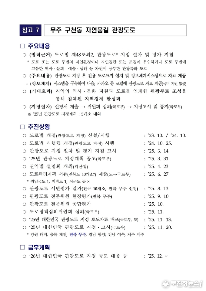 간선도로망 확충과 지역 기반사업도 지속 추진됐다. 국지도 49호선 동향~안성 구간이 개통됐고, 부안~흥덕 국도 건설이 착공됐다. 제6차 국도·국지도 건설계획 일괄예타 대상사업으로 14개 노선이 선정되는 등 중장기 도로망 구축도 안정적으로 진행되고 있다. 무주 구천동 자연품길은 대한민국 관광도로로 선정돼 지역 관광 활성화 기반을 마련했다.