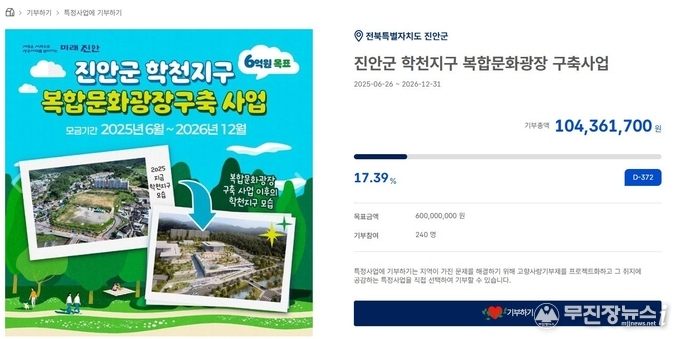 진안군이 고향사랑기부제 지정기부사업으로 지난 6월부터 추진 중인 “학천지구 복합문화광장 구축사업”이 모금 시작 6개월 만에 누적 모금액 1억 원을 달성했다.
