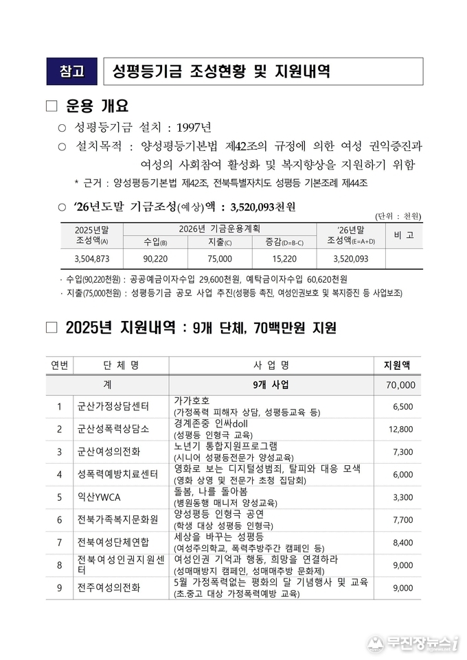 전북특별자치도가 성평등 문화 확산과 여성 권익 증진을 위한 지원에 나선다.