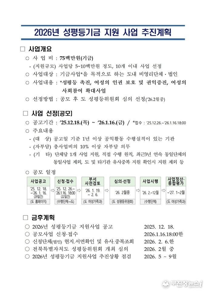 사업 신청은 내년 1월 16일 18시까지 전북도청 여성가족과에 방문 또는 우편으로 접수하면 된다. 도 성평등위원회의 심의(2월 중 예정)를 거쳐 최종 선정 결과를 개별 통보할 계획이다.
