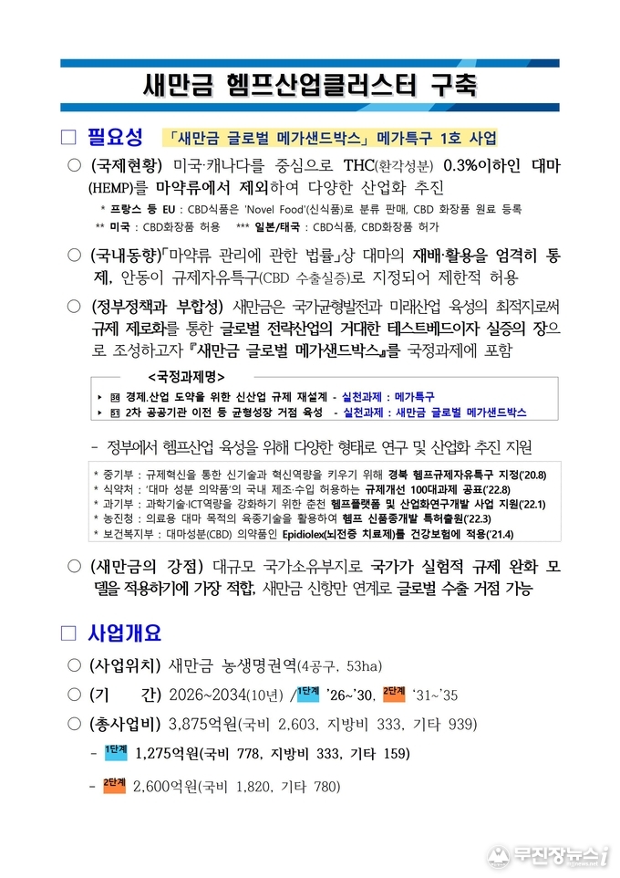 사업 부지는 새만금 농생명권역 4공구 53ha다. 1단계(2026~2030년)에는 농식품부의 타당성 용역을 포함, 1,275억 원을 투입해 부지 조성과 스마트팜 등 2ha 규모 재배시설 구축, 헴프산업진흥원과 안전관리센터 설립, 10ha 규모 기업 입주단지 조성 등을 추진한다. 2단계(2031~2035년)에는 2,600억 원을 들여 의료용 헴프산업 기반과 CDMO(위탁개발생산) 시설, 임상·비임상 평가 지원체계를 갖출 계획이다.