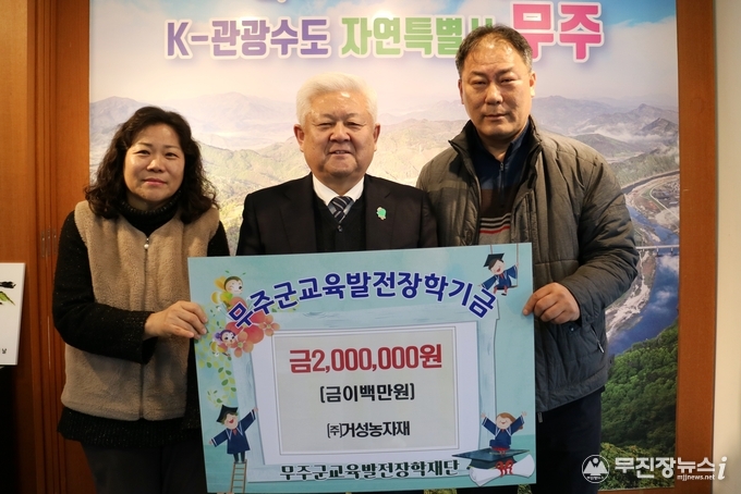 무주군 무주읍에 소재한 거성 농자재가 지난 29일 (재)무주군교육발전장학재단에 장학금 2백만 원을 기탁했다.