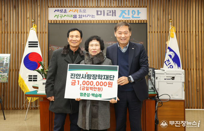 진안군 부귀면에 거주하는 엄준섭·백승례 부부가 지난 26일 진안사랑장학재단(이사장 전춘성)에 기부금 1백만원을 전달하며 지역인재 양성에 힘을 보탰다.