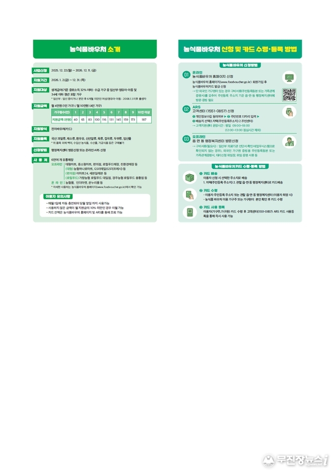 또한 바우처 지원 기간도 기존 10개월에서 12개월로 확대돼, 대상 가구는 연중 안정적으로 신선한 국산 농축산물을 구매할 수 있게 된다.