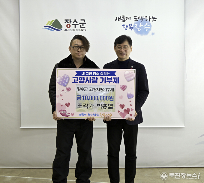 이날 기탁식에는 최훈식 장수군수와 박홍엽 조각가가 참석한 가운데 진행됐으며 박 조각가는 지난 2023년에도 고향사랑기부금 500만 원을 기탁한 바 있어 이번 기부로 장수군에 대한 변함없는 애정을 다시 한 번 보여줬다.