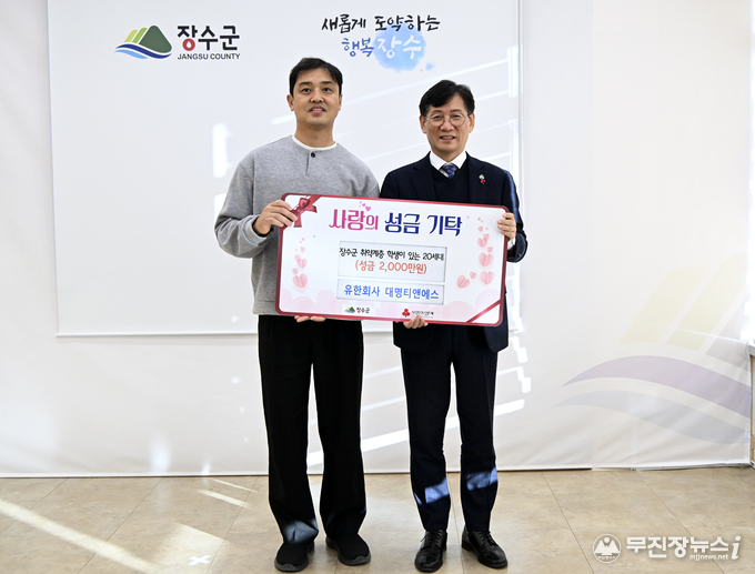 장수군은 유한회사 대명티앤에스(대표 김상희)가 지역 내 조손가정과 한부모가족, 차상위계층 가운데 초·중·고 및 대학생이 있는 가정을 돕기 위해 성금 2,000만 원을 기탁했다고 12일 밝혔다.