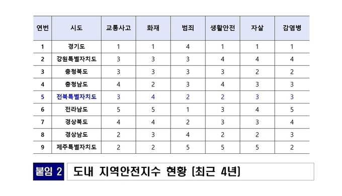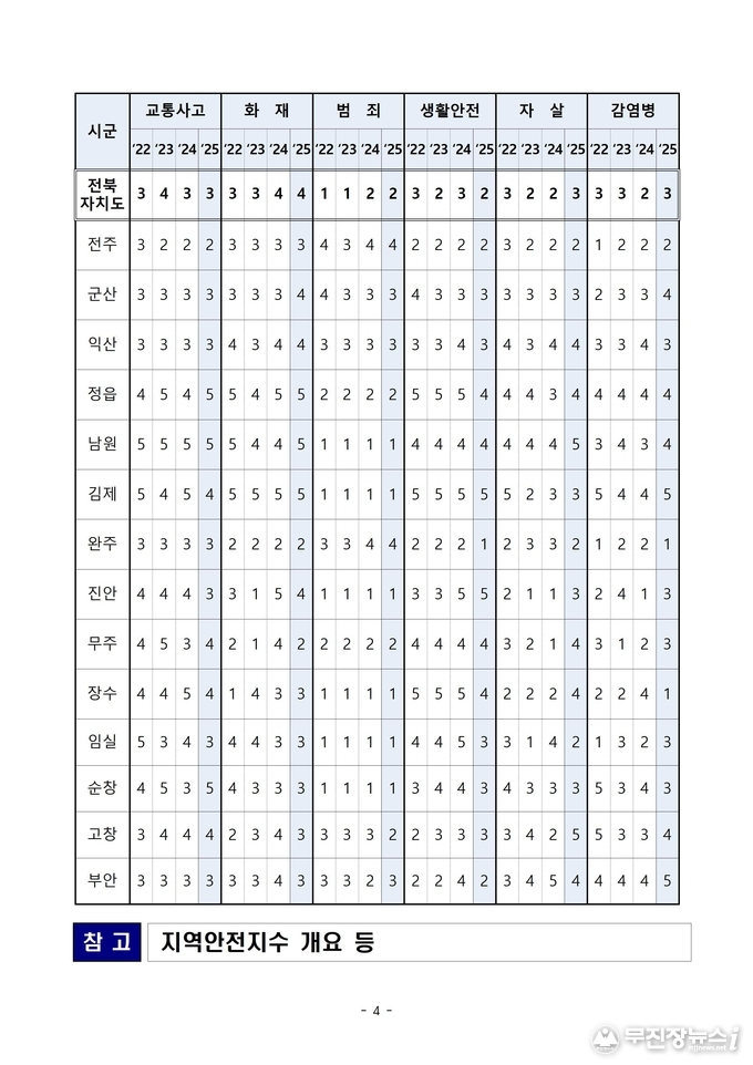 전북자치도는 올해 교통사고 3등급, 화재 4등급, 범죄 2등급, 생활안전 2등급, 자살 3등급, 감염병 3등급을 기록했다. 이 가운데 범죄와 생활안전 분야는 우수 등급(1~2등급)에 포함됐으며, 전체적으로 전국 9개 광역도 중 고른 수준의 안전지수를 유지했다는 평가다.