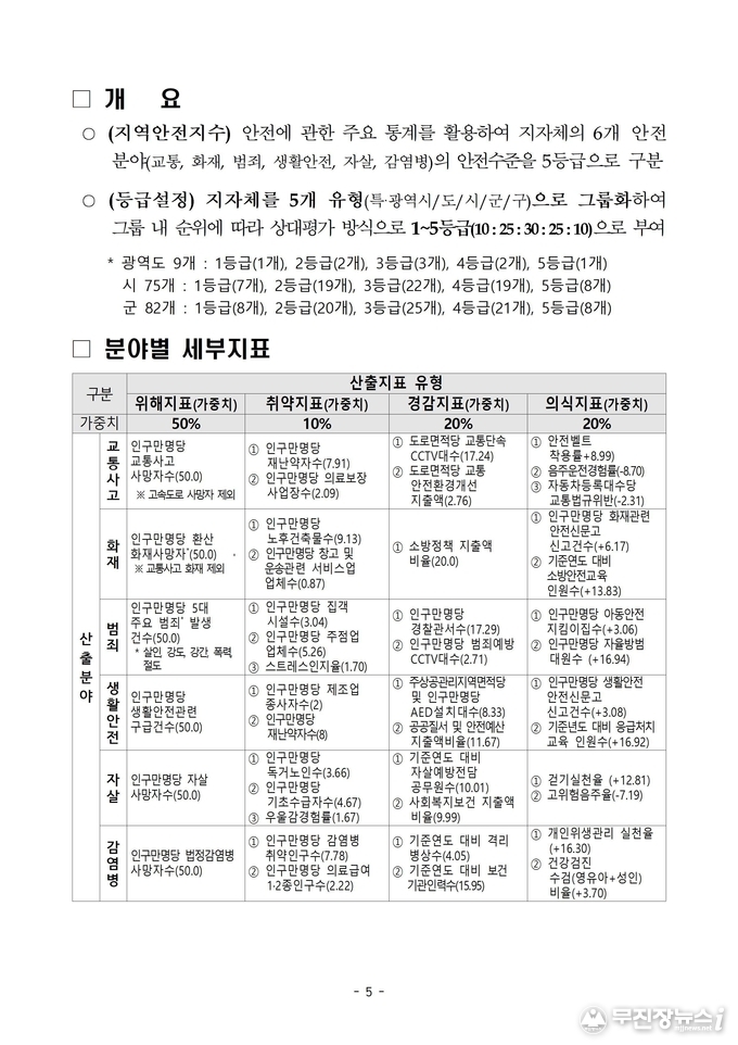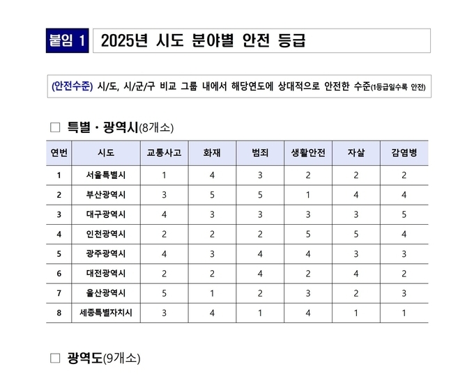 지역안전지수는 교통사고·화재·범죄·생활안전·자살·감염병 등 6개 분야의 안전 수준을 지자체 유형별로 나눠 상대 평가한 지표로, 1등급에 가까울수록 안전 수준이 높은 것을 의미한다.