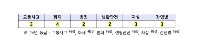 특히 생활안전 분야는 전년 대비 1단계 상승했다. 생활안전 관련 구급건수가 2023년 6,985건에서 2024년 6,864건으로 감소한 것이 영향을 미친 것으로 분석된다.