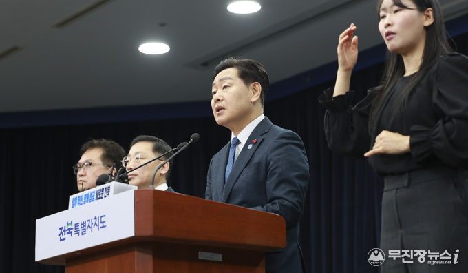 김관영 전북특별자치도지사는 15일 기자회견을 열고 “전북이 지방주도성장의 선두에 서겠다”며, 전북의 다음 100년을 여는 3대 핵심 전략으로 ▲완주·전주 통합 ▲재생에너지 기반 반도체 확장 거점 ▲군산조선소 완전 재가동을 공식 제시했다.