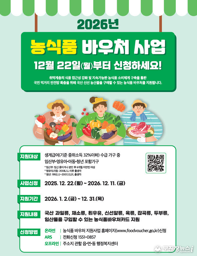 박은석 무주군농업기술센터 농촌활력과장은 "농식품 바우처는 취약 계층 군민들이 신선하고 균형 잡힌 농식품을 섭취할 수 있도록 뒷받침하는 정책“이라며 ”소급 지원이 되지 않는 만큼 대상 가구들이 꼭 신청해서 혜택을 누릴 수 있도록 홍보에도 최선을 다할 것“이라고 밝혔다.
