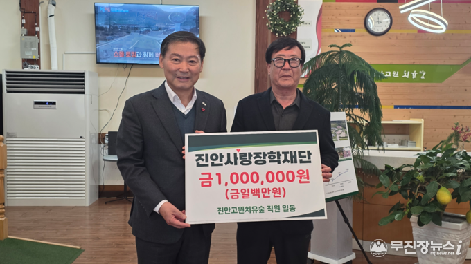 진안고원 치유숲 직원들이 16일 진안사랑장학재단(이사장 전춘성)에 기부금 100만원을 전달하며 지역인재 양성에 힘을 보탰다.
