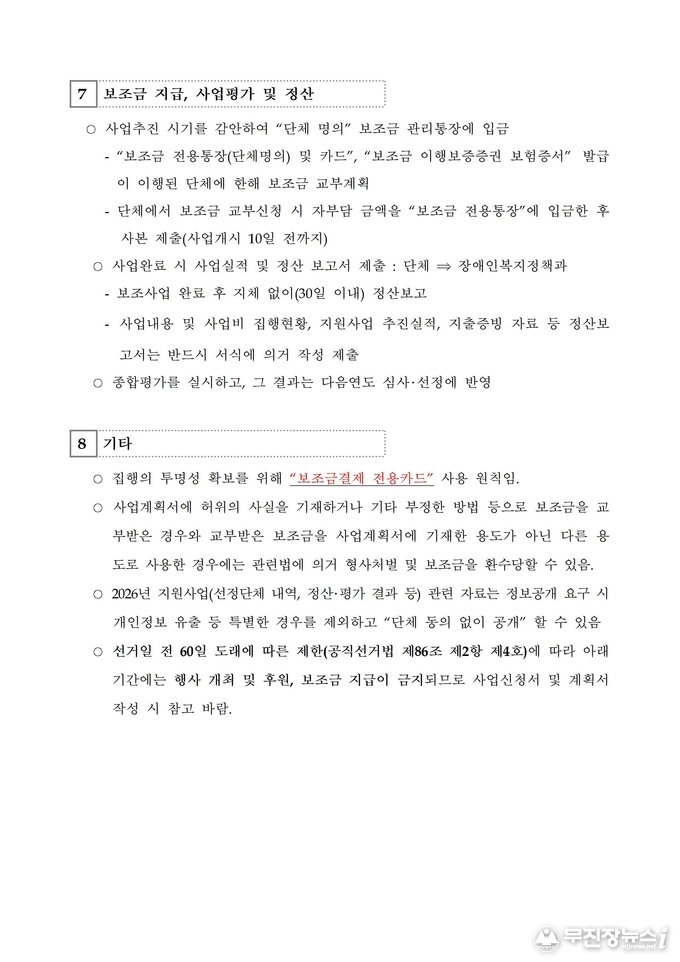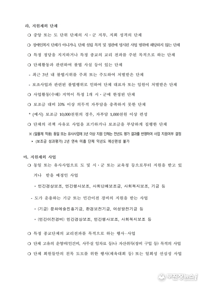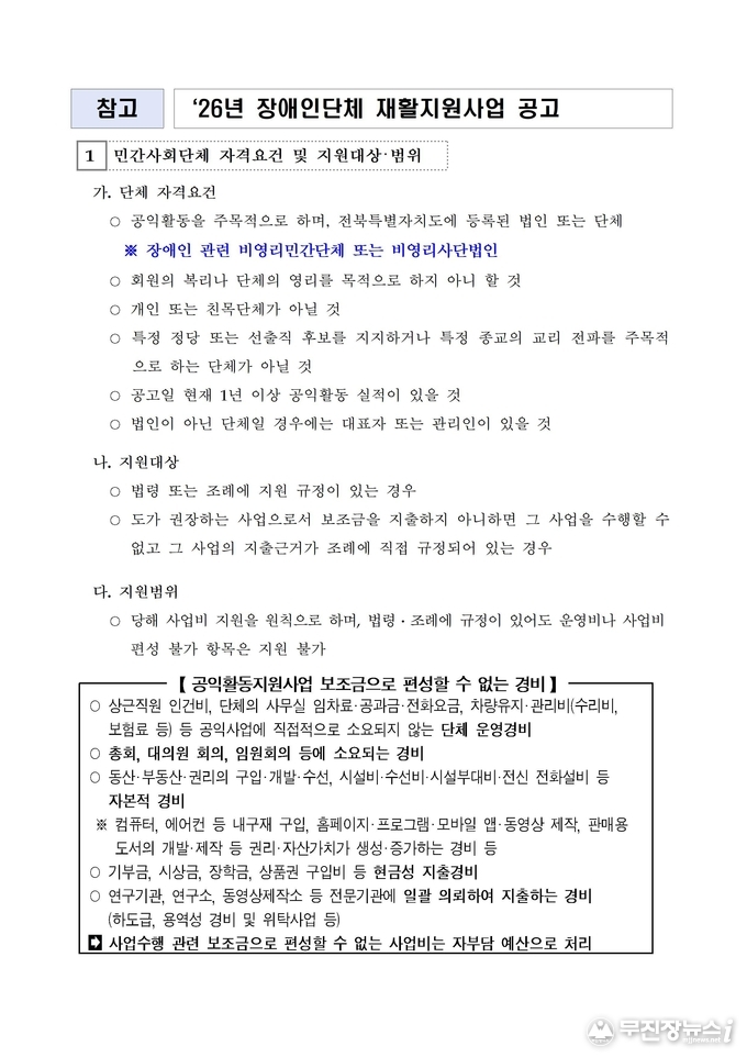 공모 대상은 전북특별자치도에 등록된 장애인 관련 비영리 민간단체와 비영리 사단법인으로, 공익활동 실적이 1년 이상인 단체에 한해 신청할 수 있다. 다만, 단체 운영비나 인건비, 자산 취득을 목적으로 한 사업 등은 지원 대상에서 제외된다.