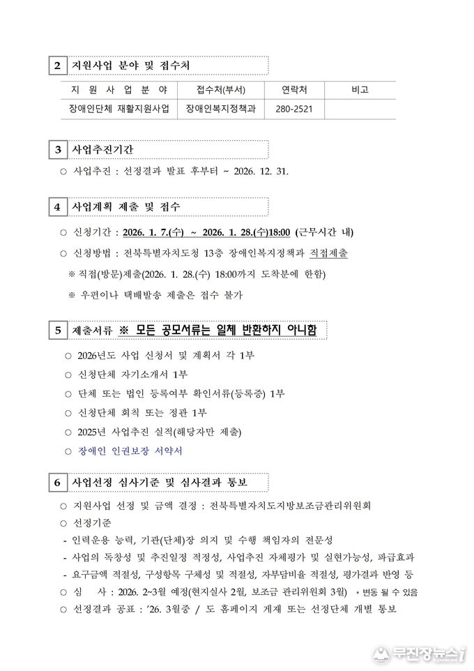 전북특별자치도는 장애인의 사회참여 확대와 장애인단체의 역량 강화를 위해 ‘2026년 장애인단체 재활지원사업’ 공모를 추진한다고 20일 밝혔다.